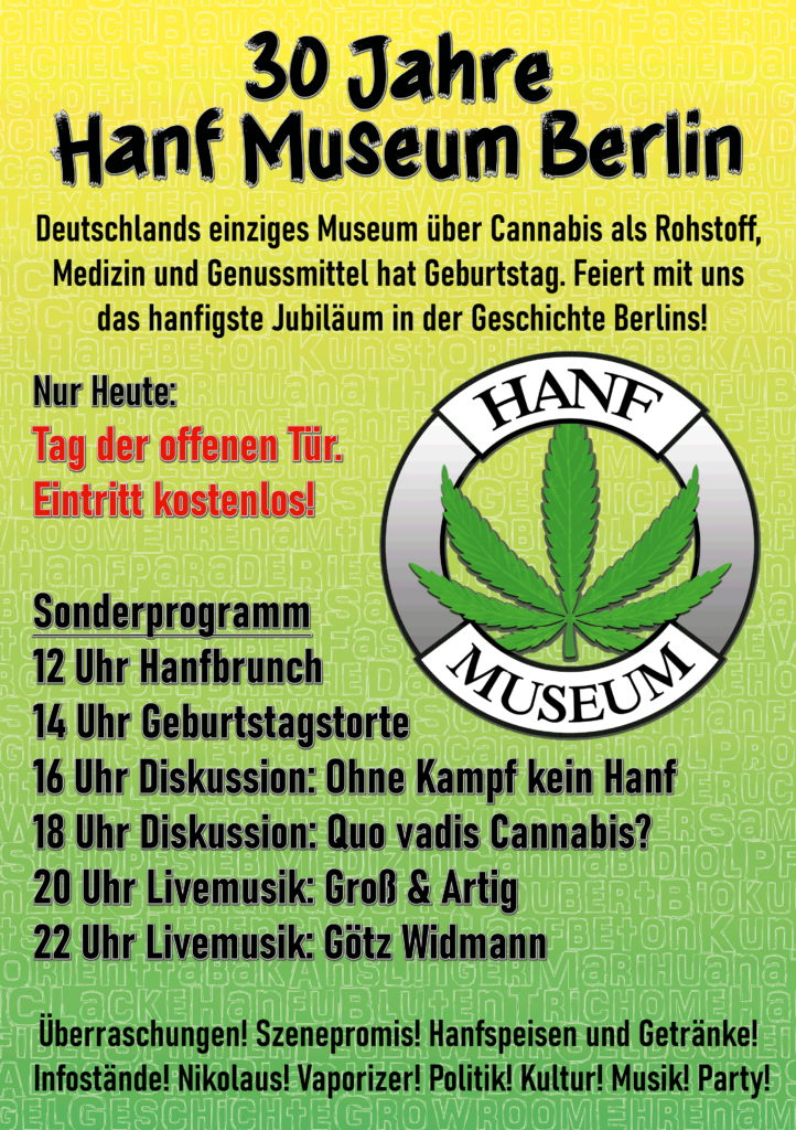 Wir freuen uns auf Euch und den 30. Geburtstag des Hanf Museum Berlin – Freitag 06.12.2024 10-24 Uhr.